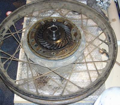 Dann wird das Kardangehäuse erwärmt und mit der zum Einstellen benutzten Papierdichtung zusammengeschraubt. Zur Sicherheit mache ich meistens noch etwas Dichtmasse auf die Papierdichtung. Die restlichen Sachen wie: Sicherungsbleche biegen, Bremslichtkontakt (nur MZ-Kardan), Bremsmechanik und Schauben sollen kein Problem mehr darstellen.
