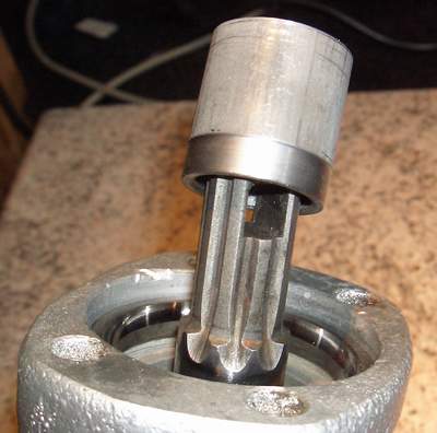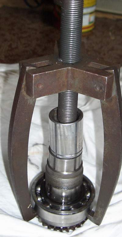 Man kann den Abzieher verwenden, den Dieter Heyne anbietet (man kann diesen aber ruhig zu diesem Moment schon bestellen, denn später erweist er sich als sehr hilfreich), was die elegantere Lösung ist, oder man erwärmt den Deckel und treibt vorsichtig die ganze Welle inklusive Tellerrad aus dem Deckel.