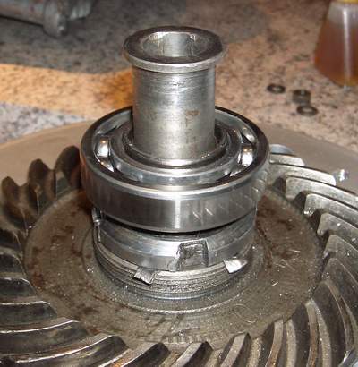 Das ganze wird jetzt in den Deckel eingesetzt. Wichtig ist dabei, daß man das Lager wirklich bis an den Anschlag bekommt. Ansonsten kann es passieren, daß man den Lauf von Triebling und Tellerrad super eingestellt hat, die Sache einbaut und beim ersten richtigen Gasgeben das Tellerrad ein paar Millimeter nach links Richtung Rad rutscht. Resultat: Die Verzahnung trägt nur Teilweise und der Ölfilm zwischen den Zähnen reißt ab. Dann entstehen die üblichen Reibespuren, Metallspäne und Bruchstücke setzen sich in die Lager, was das Kardan zerstört.