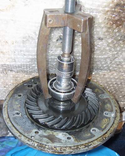 Falls bei jemanden das selbe eintritt kann ich diese Vorgehensweise nur empfehlen. Dazu muß mit viel Fingerspitzengefühl der Federring vor dem kleinen Kegelzahnrad entfernt werden, anschießend das Gehäuse gut erwärmt und der Triebling inklusive aller Anbauteile in Richtung Kardanwellenanschluß herausgetrieben werden. Ist dies vollbracht kann man gut sanfte Gewalt (Abzieher) anwenden, um den inneren Ring des QB20 herunterzubekommen.