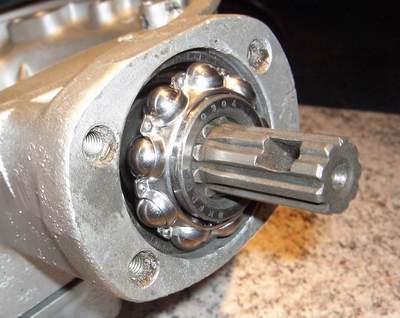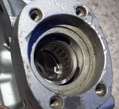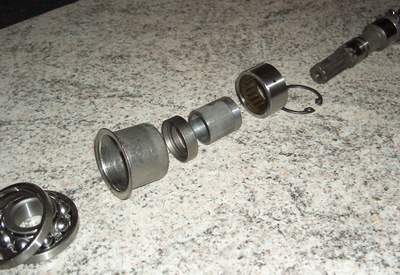 Wenn die Kardanwelle entfernt wurde, und der Wellenseitige Lagersitz des QB20 Lagers nicht mehr der beste ist - kann man die Welle mit relativ geringer Kraft ein Stück nach innen schieben, wobei an einem gewissen Punkt die Walzen des hinteren Lagers herausfallen. Ganz demontieren kann man die Welle leider nicht - daran hintern einem die zwei Halbmonde, die unter dem Ring sitzen, der das QB20 auf der einen Seite in Position hält.