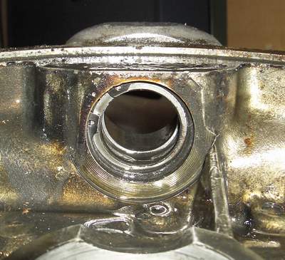 ... aufschieben. Danach die Stehbolzen rein. Ich dichte diese immer noch mit Dichtmittel ein, da ich schon gesehen habe, daß manchmal die Bohrungen durchgehen und durch das Gewinde dann Öl austreten kann.